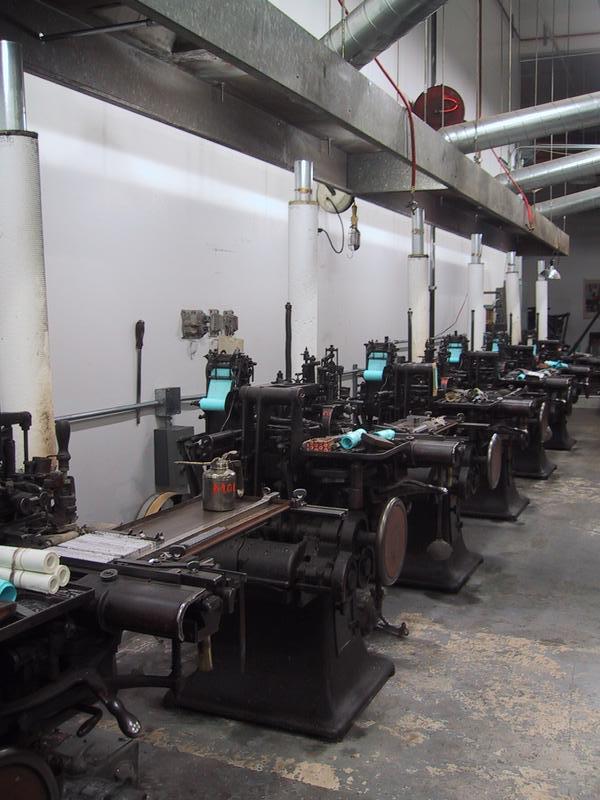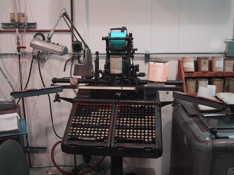 We have six complete composition casters, each with its own quirks, each suited for a certain size. The farthest caster is connected via a serial box equipped with microswitches to a Macintosh Quadra, allowing us to feed text files to the caster. | |