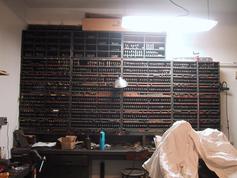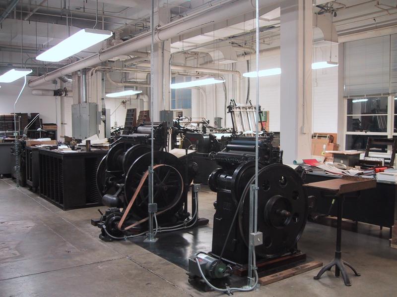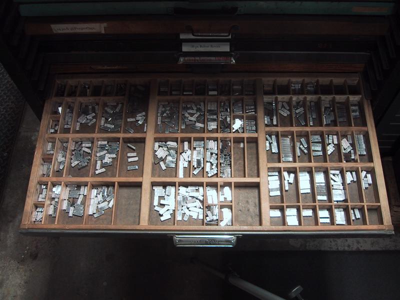We have many many many cases of type, some of which came from the Grabhorn Press, others from Mackenzie & Harris. The trim saw, which we use to cut slugs and undercut (kern) characters, sits in the back. | |