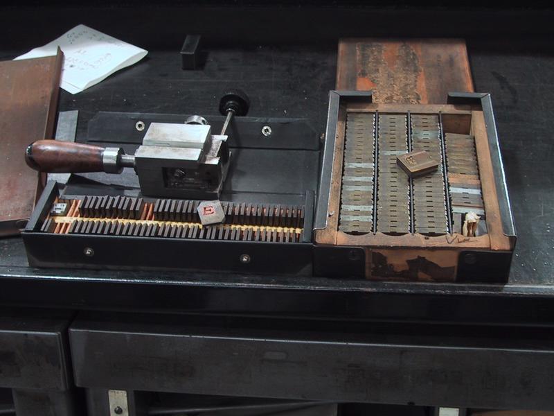On the bottom left is a case and sample mat of American-type Thompson mats, these ones for 36 point Goudy Light Italic (Frederic Goudy). On the right is a case and sample mat of English-type Thompson mats, those for 36 point Centaur (Bruce Rogers). Sitting above the "E" is a mat holder, which is loaded into the caster and allows the casterman to properly align the mat on the body. | |