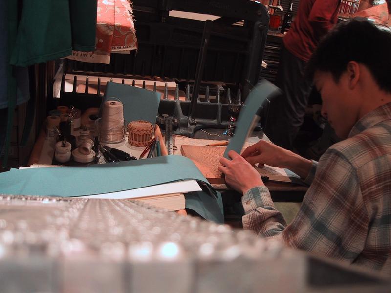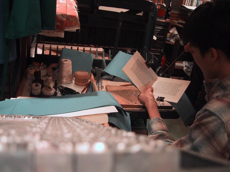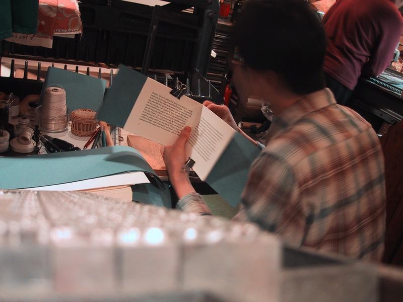 Here I am finishing up a batch of books, the last four copies of Brad & Amy, which I presented to a friend at his wedding in October. These copies are going an old mentor of mine and the author. Here the thread is being led through the center-hole.