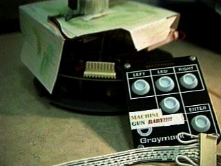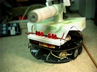 Several students modified the robots and they held a little competition where we tried to pull the most weight, complete an obstacle course, be best of show, or go the fastest. I entered the contest for "best of show." The modifications on this robot consist of 6 additional transistors, and lots of resistors. Basically what I did was hook the circuitry from a pocket equalizer (the ones that make machine gun, air-raid, and other various annoying noises) up to the speaker driver so every time you would program the buzzer, it would make a machine gun noise. I also hooked up a Gattling gun that I made out of paper and hooked it to the same output of the buzzer driver input. The 6 LEDs on the front of it trace outwards when the led button is pressed. I did win the contest.